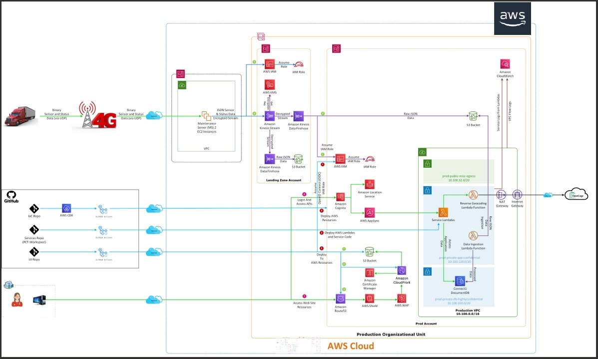 The data is delivered via Amazon Data Firehose (Kinesis) to various Amazon S3 buckets across multiple Amazon Web Services (AWS) accounts, organized by environment. Event notifications from these S3 buckets trigger Simple Notification Service (SNS) topics, which fan out events to Simple Queue Service (SQS) queues for further processing. An AWS Lambda function, triggered by SQS messages, processes, and transforms the JSON files, performs computations, updates Amazon DocumentDB, and publishes messages to an SNS topic for downstream consumers. The system also involves an Amazon OpenSearch domain for storing GPS locations, geofences, and event history, with plans to deprecate this functionality in favor of an API accessing data from an S3-based Datastore.